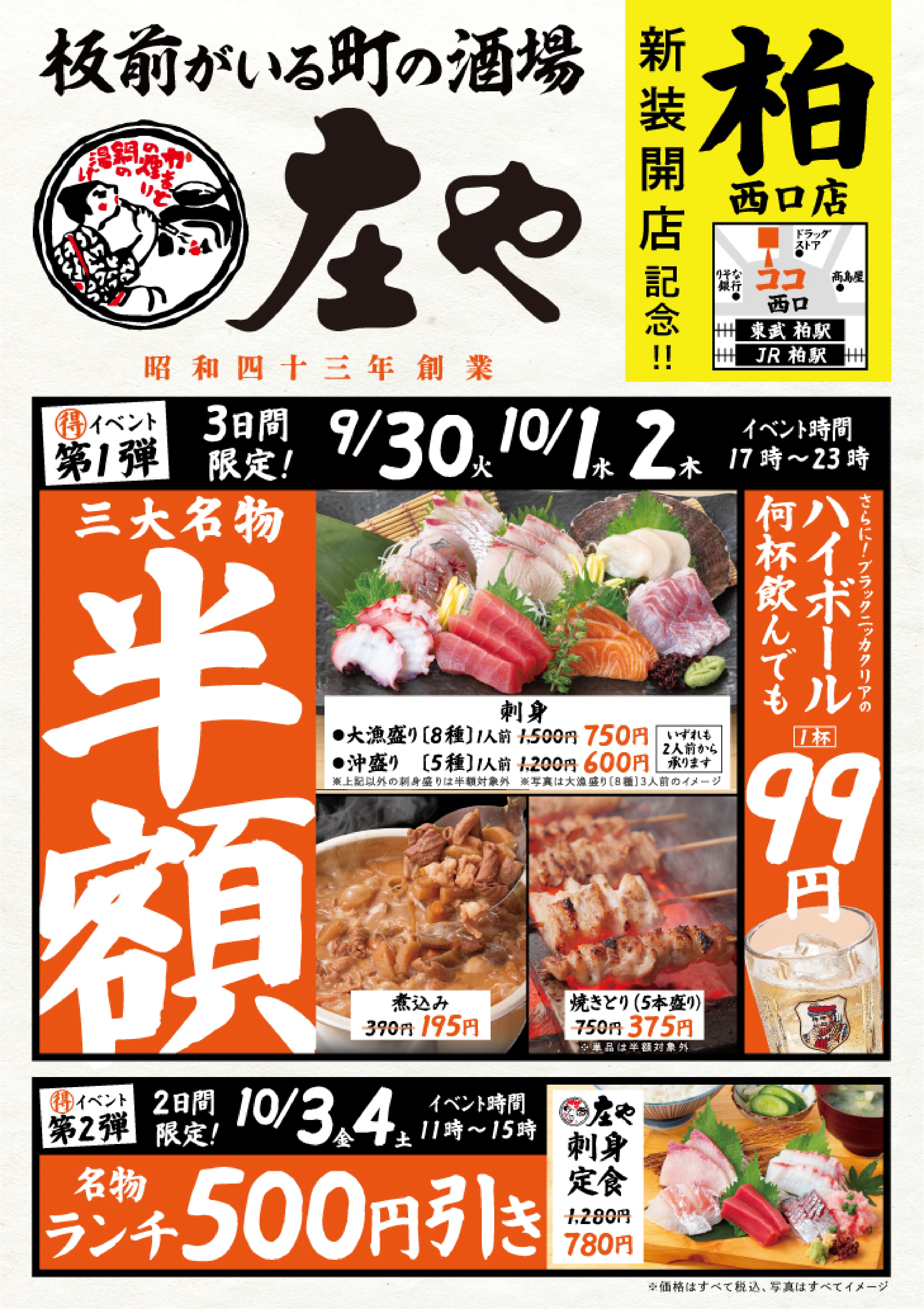 株式会社大庄(東京都大田区/代表取締役社長:平 了壽)は、千葉県柏市の板前がいる町の酒場『庄や』柏西口店を全面改装し、リニューアルオープンします。これを記念し、第一弾として、2025年9月30日(火)~10月2日(木)の夜限定で「刺身盛り合わせ」「煮込み」「焼きとり」の三大名物“半額”イベントを実施。第二弾では10月3日(金)~4日(土)の2日間、昼限定で「庄や刺身定食(通常1280円・税込)」を500円引きの780円(税込)で提供します。