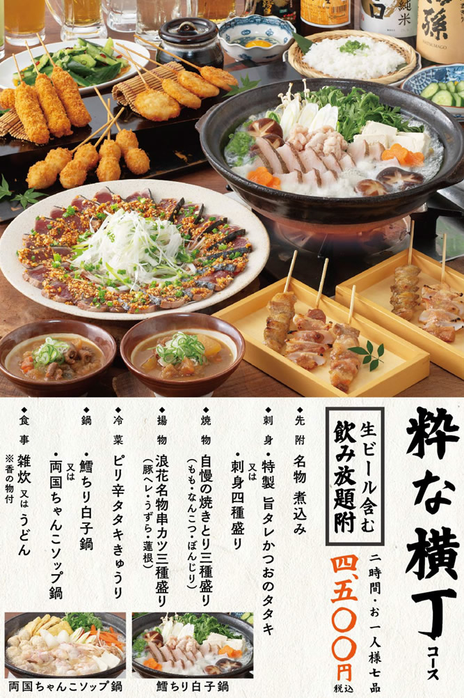 気心しれた仲間と飲むなら「粋な横丁コース」がお得です。おすすめの「旨タレかつおのタタキ」「煮込み」「焼きとり」など、全7品のボリューム満点のコースです。 |