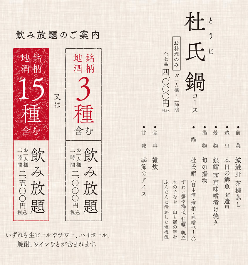 ◆銘柄地酒15種含む飲み放題:お一人様2時間+2,500円(税込)