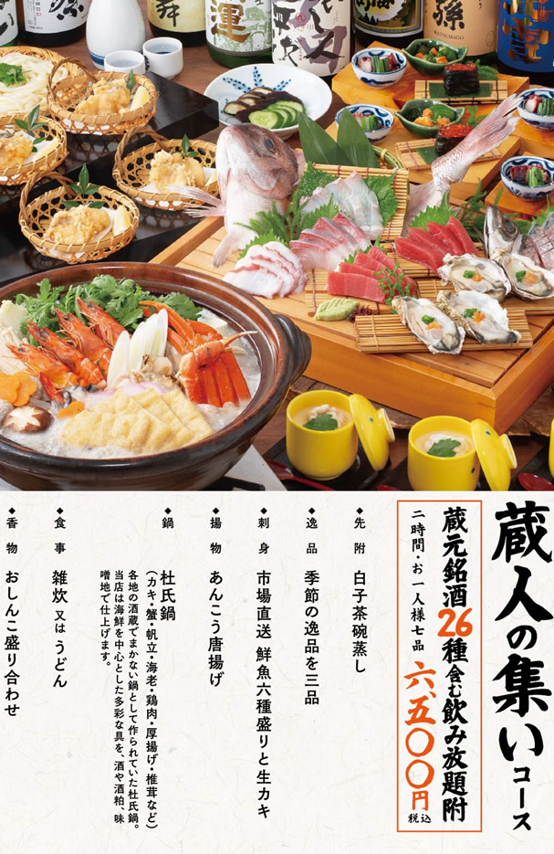 「鮮魚六種盛りと生カキ」や「あんこう唐揚げ」、「杜氏鍋」など、お料理全7品に蔵元銘酒26種含む飲み放題が2時間ついた贅沢コースです! |