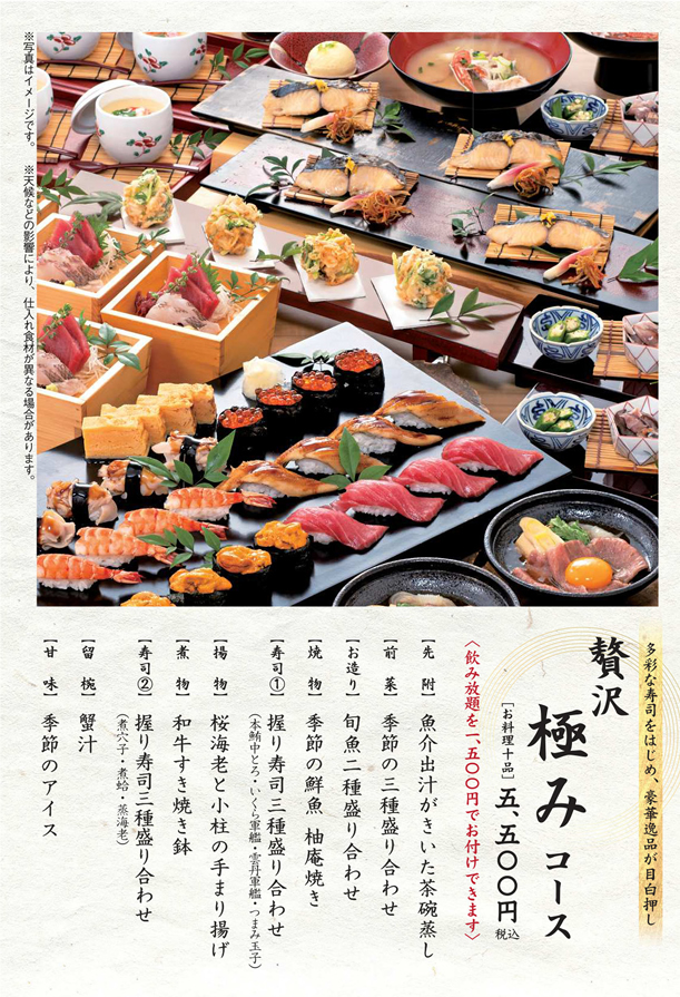 ※当日・前日のコース予約は、一部内容が変更になる場合があります。また、当日・前日以外でも仕入れの関係で一部内容を変更する場合があります。ご理解をお願い致します。 |