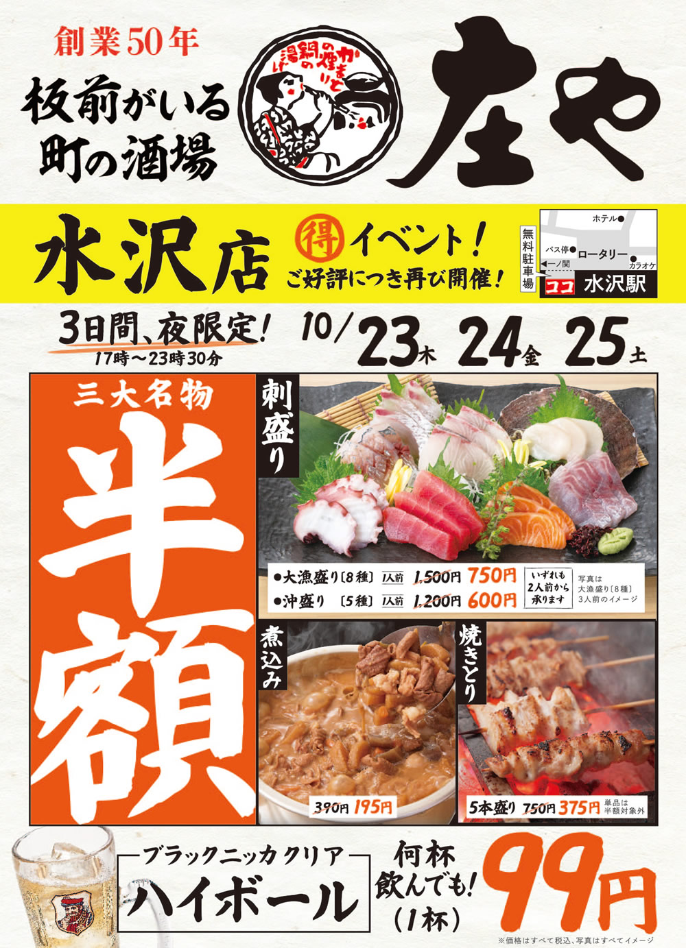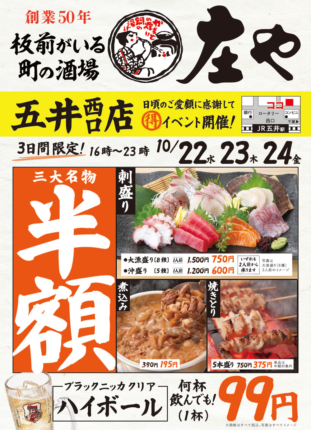 【庄や 五井西口店】三大名物 半額イベント開催!