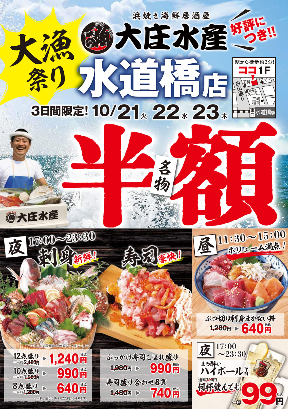 【大庄水産 京急鶴見店】10月18日(土)11:30新装開店!名物半額セール開催