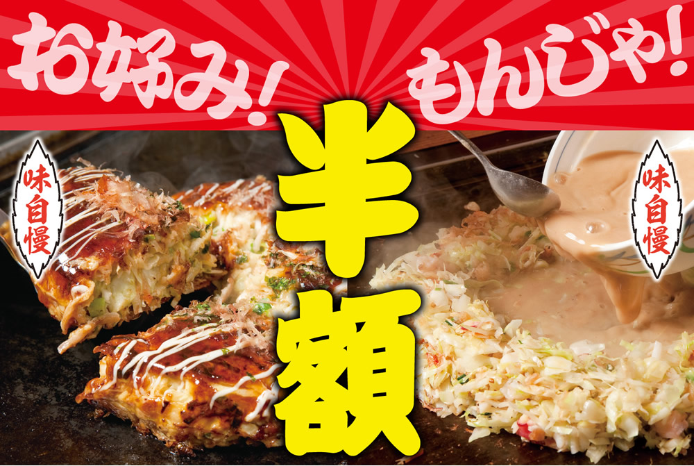 【お好みもんじゃ 赤羽店・立川店】★赤字覚悟の3日間!当店オススメ厳選4品「半額」★