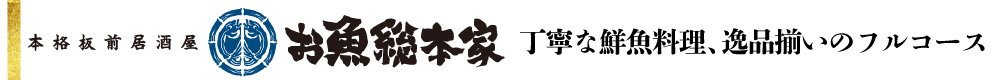 大人が心から「旨い!」と感動できる魚料理を、魚を知り尽くした板前が腕を振るう店「お魚総本家」。藁焼き・刺身・握り寿司と銘酒、温かいおもてなしで、大切な方との宴会をお楽しみください。