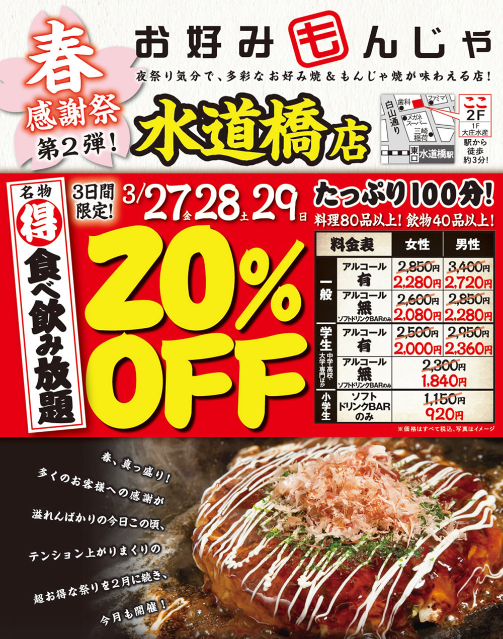 【お好みもんじゃ 水道橋店】★春の先どり感謝祭第二弾!★3日間限定!名物「食べ飲み放題」20%OFF!