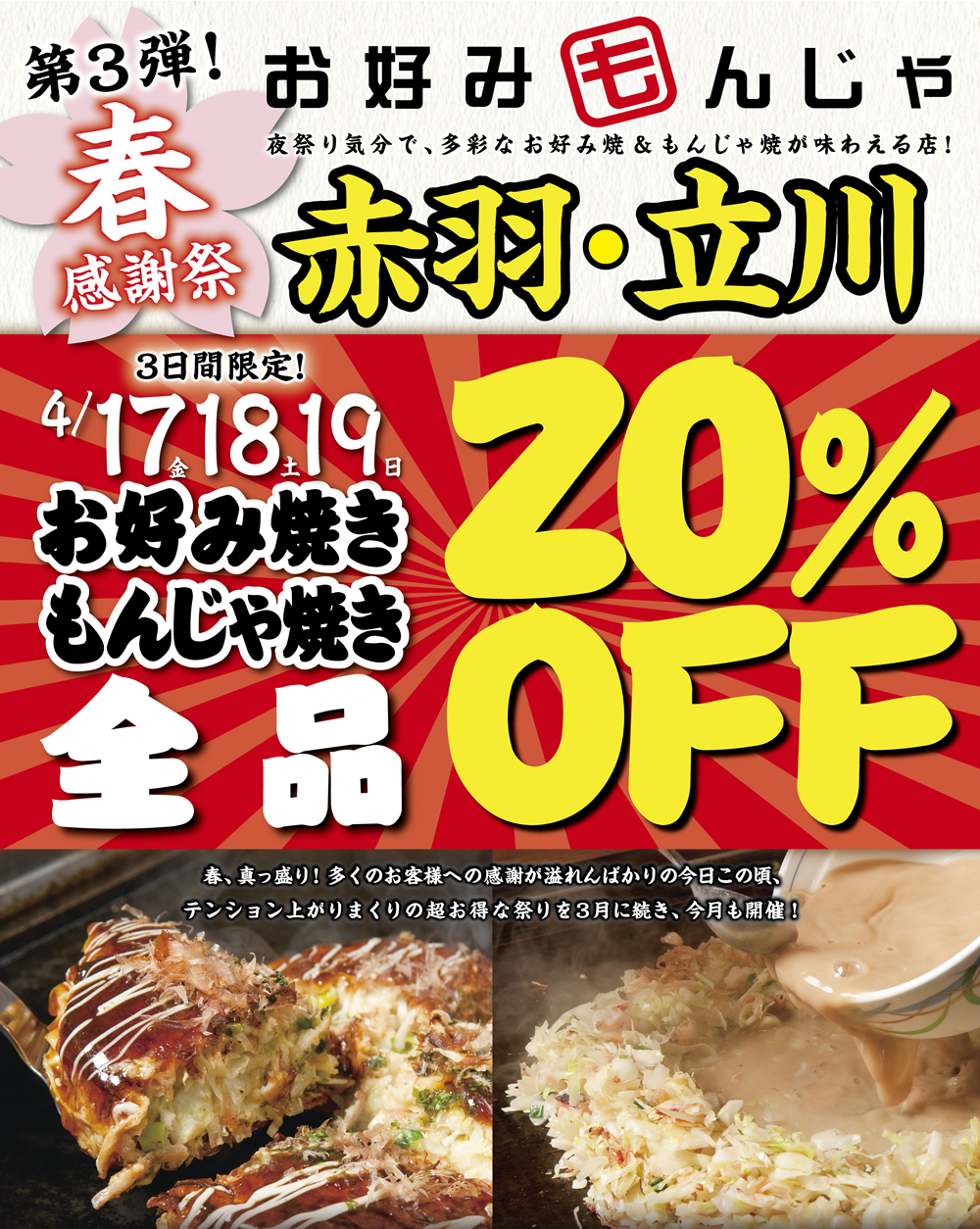 お好み焼き・もんじゃ焼き単品メニュー全35品が【20%OFF】!