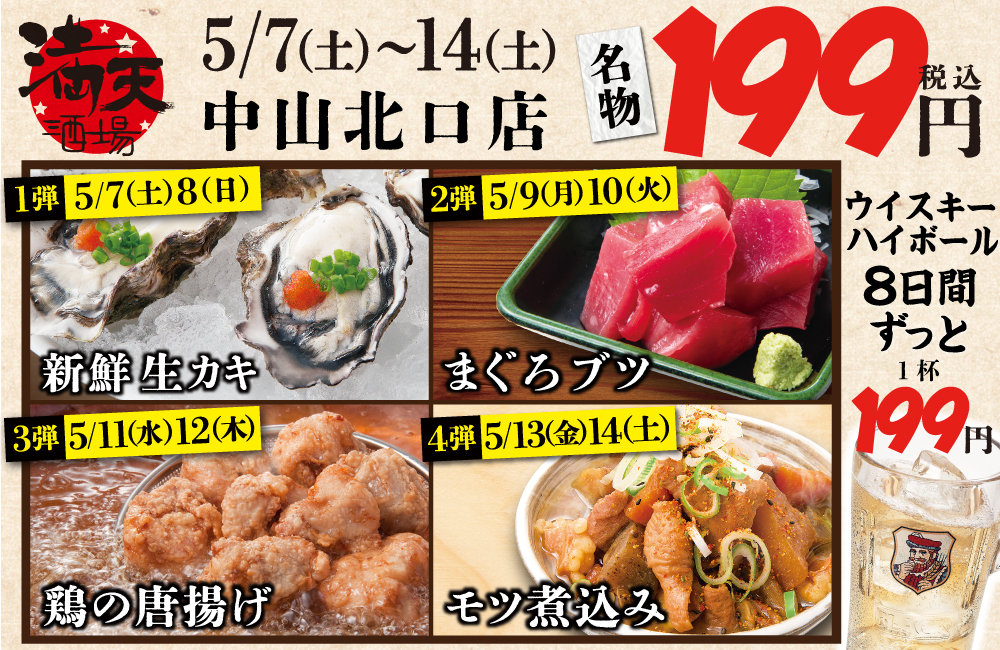 開店を記念しまして5/7~5/14までの8日間名物&ハイボール199円キャンペーンを開催!