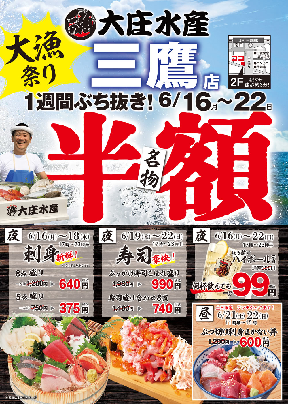 6/16~『大庄水産 三鷹店』にて1週間連続”名物料理 半額”イベント開催!