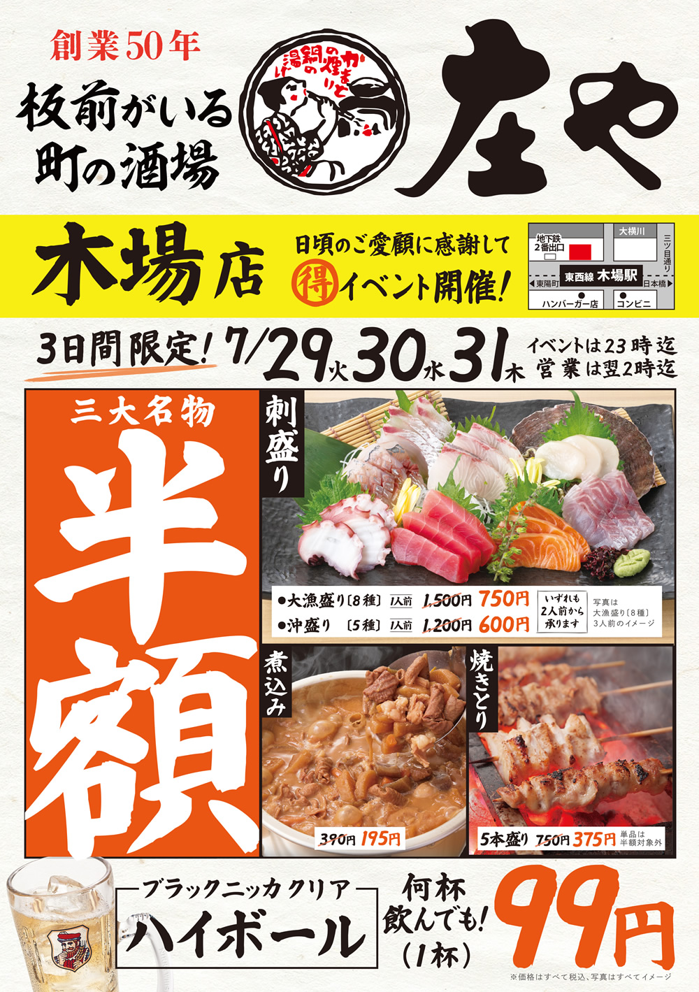 7/29~【庄や 木場店】三大名物 半額イベント!
