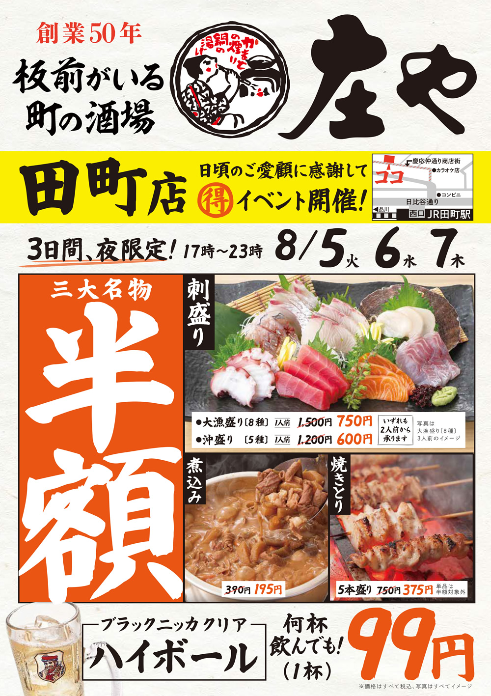 8/5~【庄や 田町店】三大名物 半額イベント!