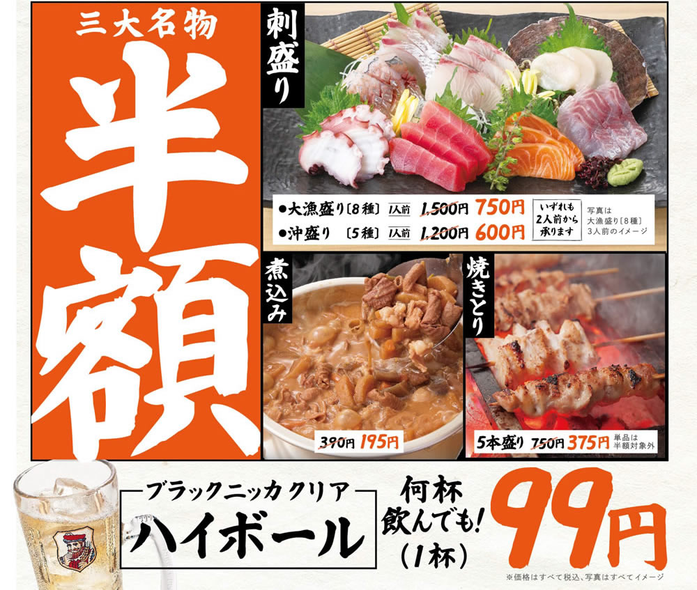 「刺盛り」「煮込み」「焼きとり」三大名物が半額になる